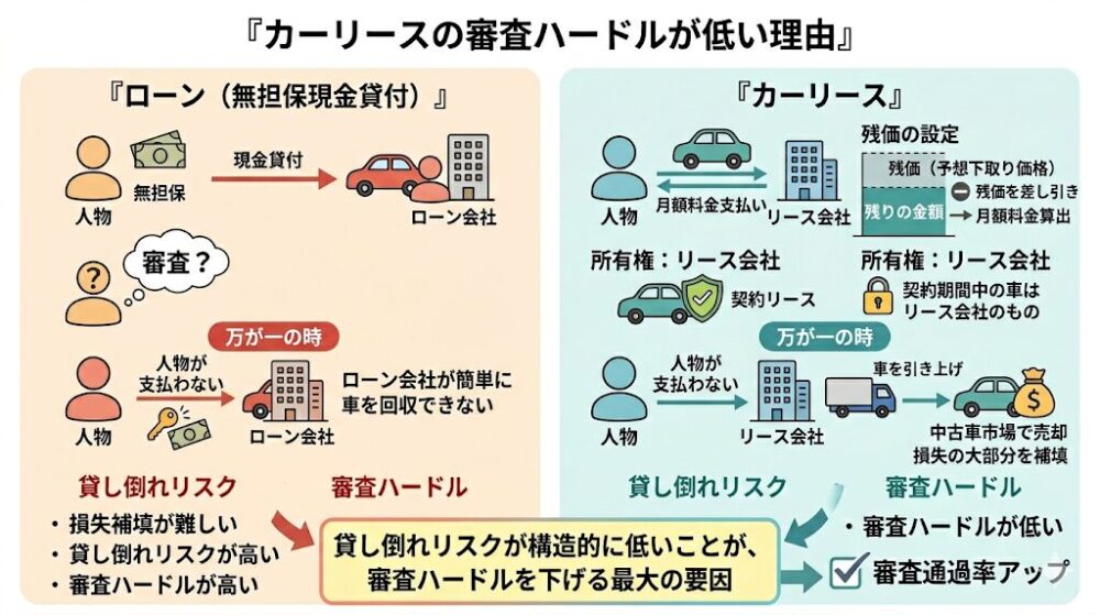 さらに重要なのは、契約期間中の車の「所有権」はリース会社にあるという点です。万が一、契約者が月額料金を支払えなくなった場合でも、リース会社は法的に車を引き上げて中古車市場で売却することで、損失の大部分を補填できます。