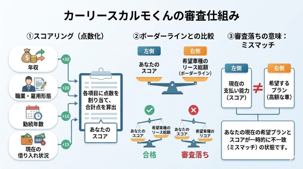 カーリースカルモくんの審査は、提携する信販会社による「スコアリングシステム(点数化)」に基づいて、極めてドライに行われます。