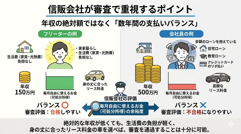 審査において信販会社が重視するのは「収入の絶対額の高さ」ではなく、「月々のリース料金を滞りなく、数年間にわたって継続して支払い続けられるバランス」が保たれているかどうかです。