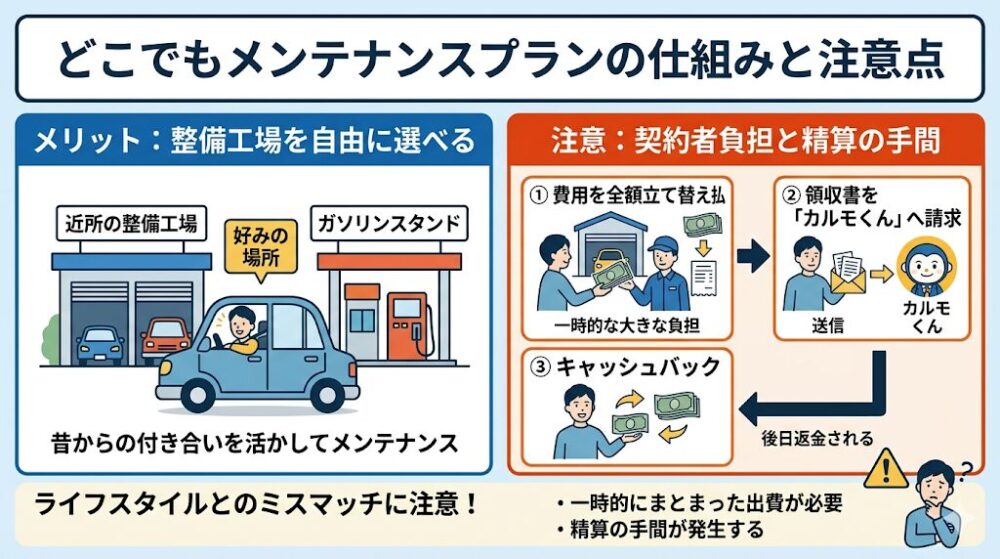 しかし最大の注意点は、メンテナンスを受けた際、契約者が一時的にその費用を全額立て替え払いし、後日領収書などを送ってカルモくんに請求(キャッシュバック)してもらわなければならないという点です。