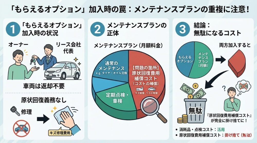 つまり、「もらえるオプション」に加入しているにもかかわらず、手厚い「メンテナンスプラン」を付けてしまうと、メンテナンスプランの月額料金に含まれている『原状回復費用補償のためのコスト』が、完全に掛け捨ての無駄になってしまうのです。