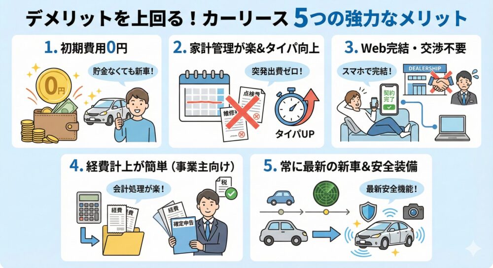ここまでデメリットを強調しましたが、それでもカーリースの利用者は年々急増しています。それは、デメリットを補って余りある強力な5つのメリットがあるからです。