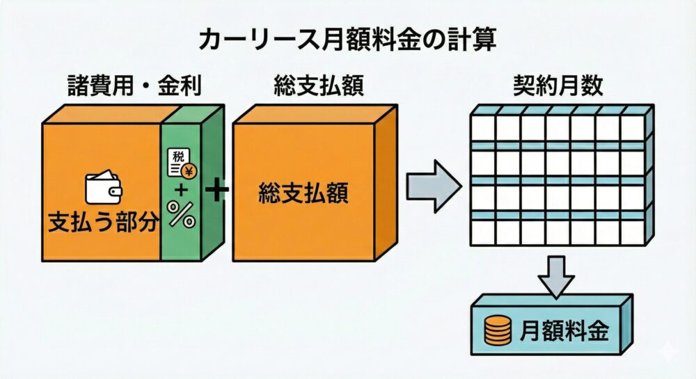 月額料金 =( (車両本体価格-設定残価) + 契約期間中の諸費用+金利相当額)÷契約月数