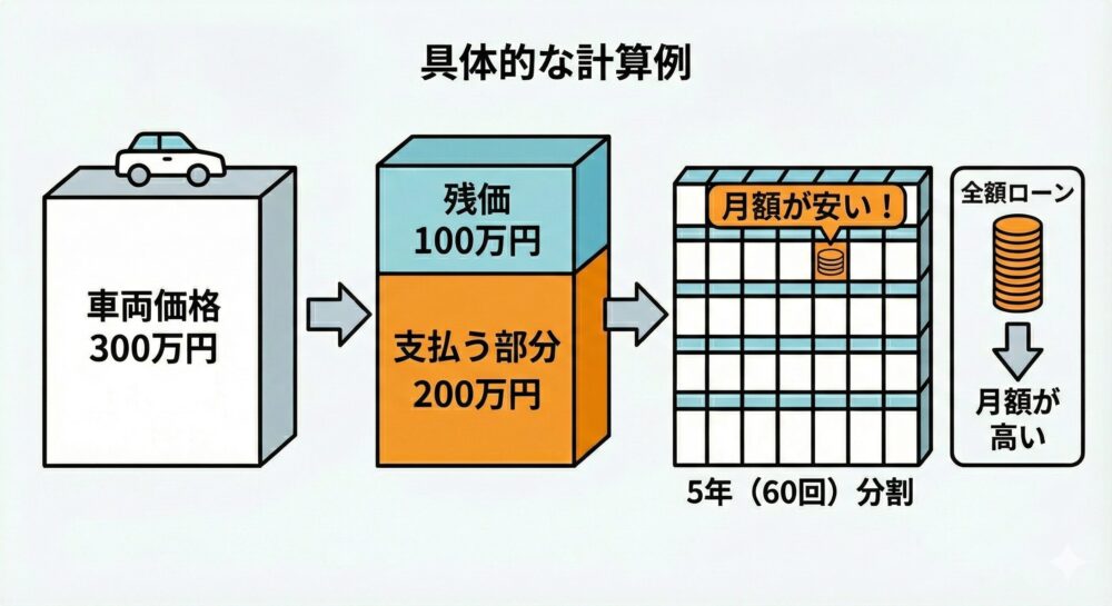 リース会社が「この車は人気車種だし、5年後でも100万円くらいの価値はあるだろう」と予測し、残価を「100万円」に設定したとします。