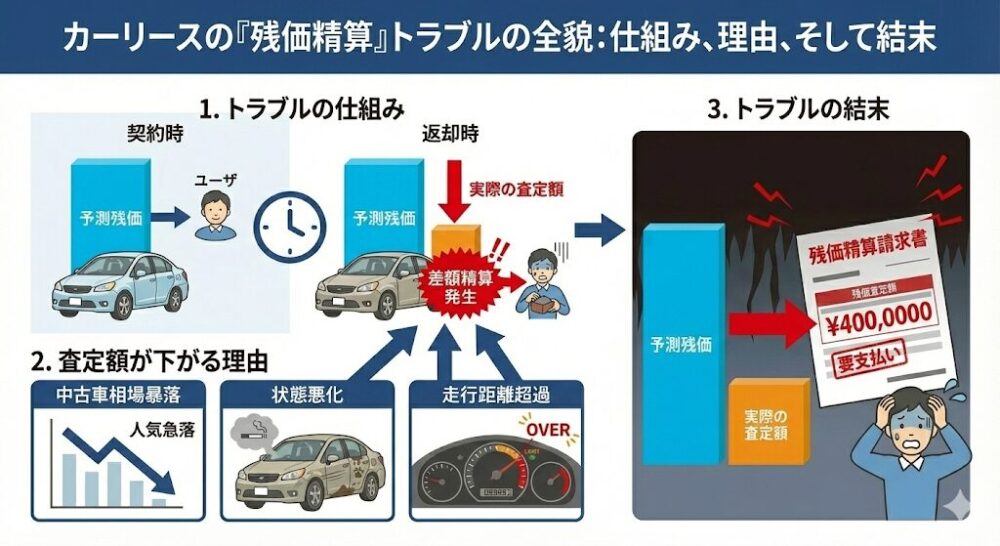 トラブルの核心は、「契約時に予測した残価」と「返却時の実際の査定額(市場価値)」にズレが生じることにあります。