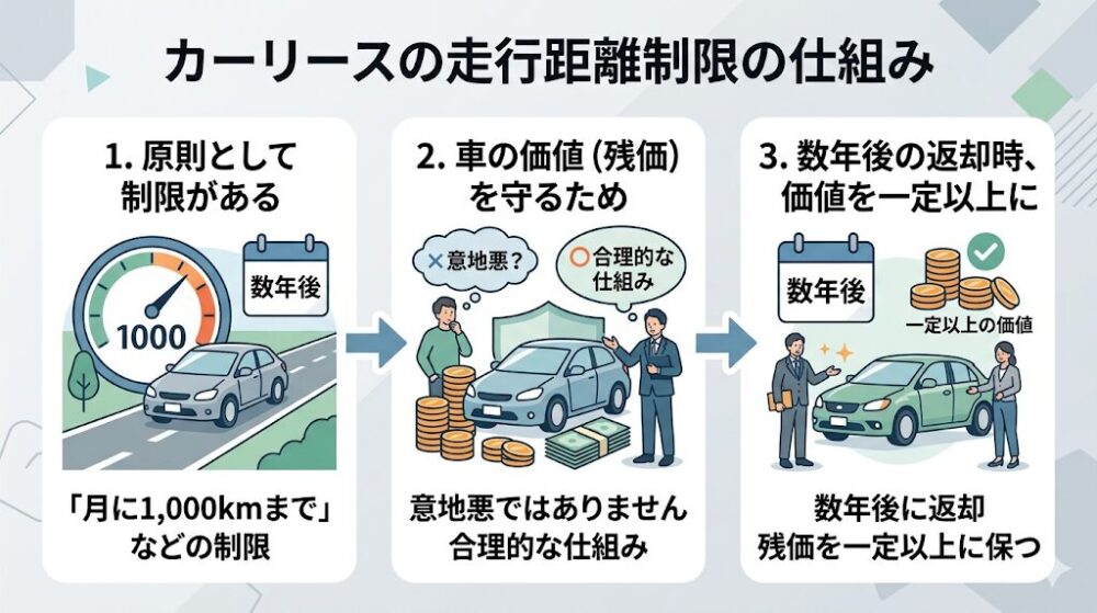 カーリースには原則として「月に1,000kmまで」といった走行距離の制限が設けられています。これはリース会社が意地悪をしているわけではなく、数年後に車を返却してもらう際、車の価値(残価)を一定以上に保つための合理的な仕組みです。