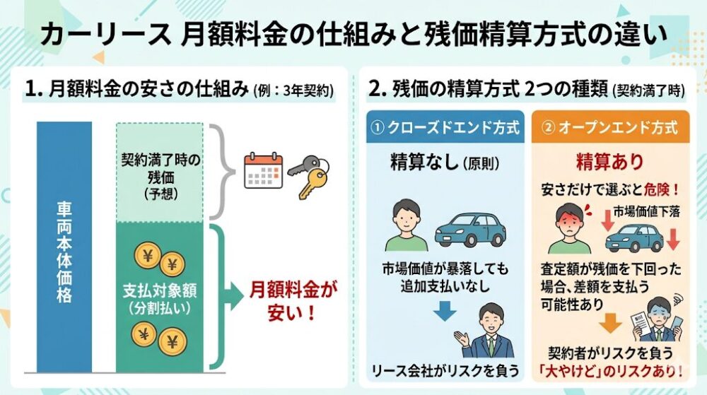 カーリースは、契約満了時の車の予測価値(残価)をあらかじめ本体価格から差し引き、残りの金額だけを分割して支払う仕組みによって、月額料金の安さを実現しています。しかし、この残価の精算方式には「オープンエンド方式」と「クローズドエンド方式」の2種類があり、ここを理解せずに月額料金の安さだけで契約すると大やけどをします。