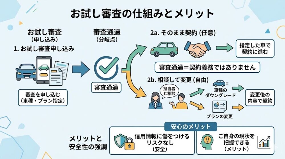 お試し審査に通ったからといって、必ずその車で契約しなければならないわけではありません。審査を通過した後に、担当者と相談しながら車種をダウングレードしたり、プランを変更したりすることが可能なため、信用情報に傷をつけるリスクなく、ご自身の現状を把握することができます。