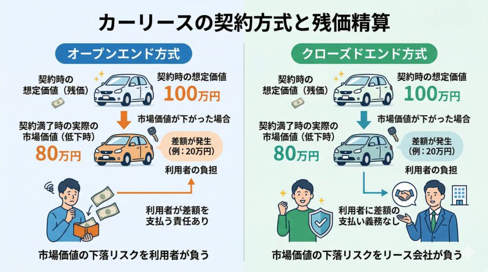 カーリースには、契約満了時の残存価格(残価)の取り扱いにおいて「オープンエンド方式」と「クローズドエンド方式」の2種類が存在します。