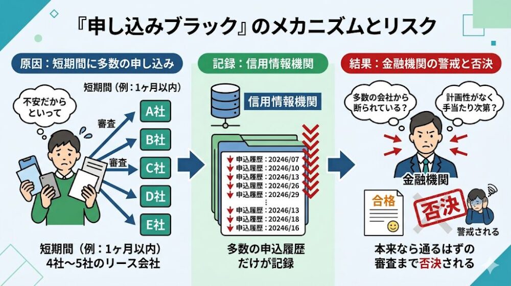 審査に通るか不安だからといって、短期間(例えば1ヶ月以内)に4社から5社のリース会社へ一斉に審査を申し込むと、信用情報機関に多数の申込履歴だけが記録されます。これを見た金融機関は「多数の会社から断られているのではないか」「計画性がなく手当たり次第に申し込んでいる」と警戒し、本来なら通るはずの審査まで否決されてしまいます。
