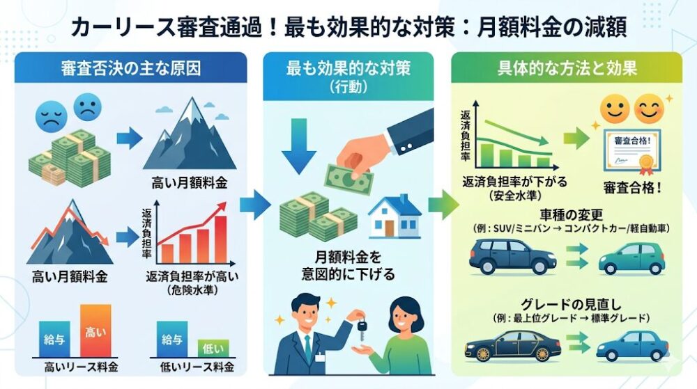 最も効果的かつ即効性のある対策は、月額のリース料金を意図的に下げることです。これにより、審査のネックとなっている「返済負担率」を安全な水準まで押し下げることが可能になります。