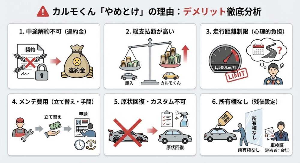 カーリースカルモくんを検討する際、最も重要なのはメリットではなくデメリットを正しく理解することです。