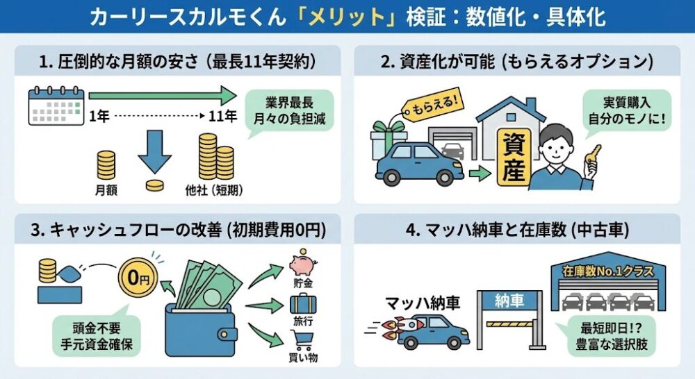 ここまでデメリットを厳しく指摘してきましたが、それでもカーリースカルモくんが多くのユーザーに選ばれているには明確な理由があります。