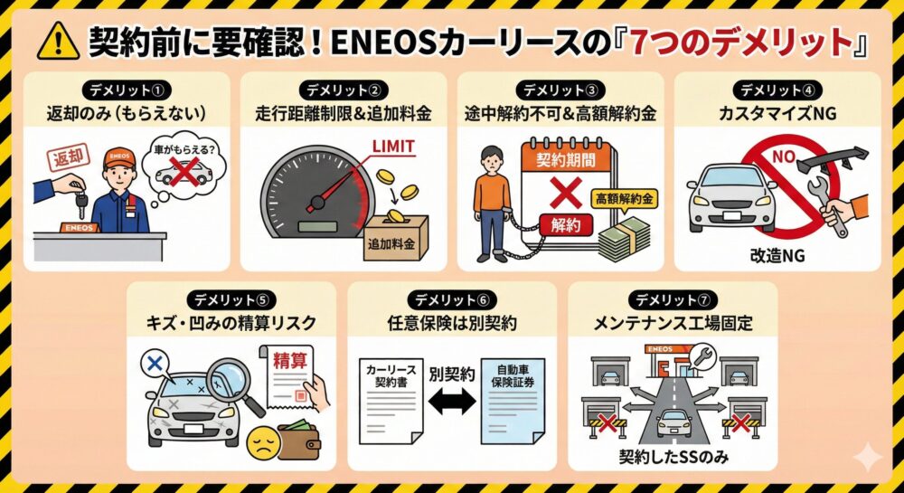 メリットは魅力的ですが、ここからが一番重要なポイントです。契約してから「知らなかった!」とならないように、ENEOSカーリースのデメリットを7つ、包み隠さずお伝えします。
