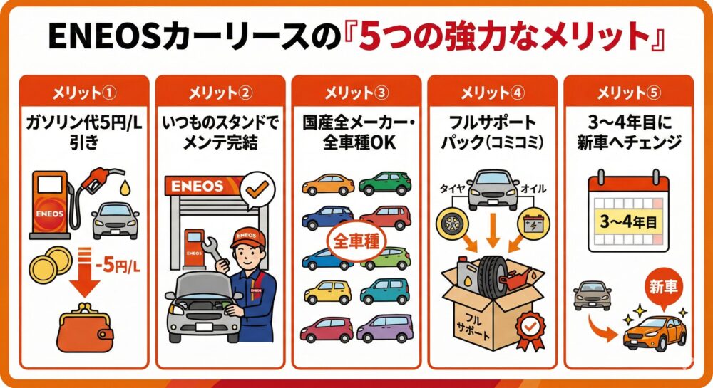 デメリットを見る前に、まずはENEOSカーリースが多くの人に選ばれている「5つの強力なメリット」を見ていきましょう。ガソリンスタンドならではの強みが満載です。