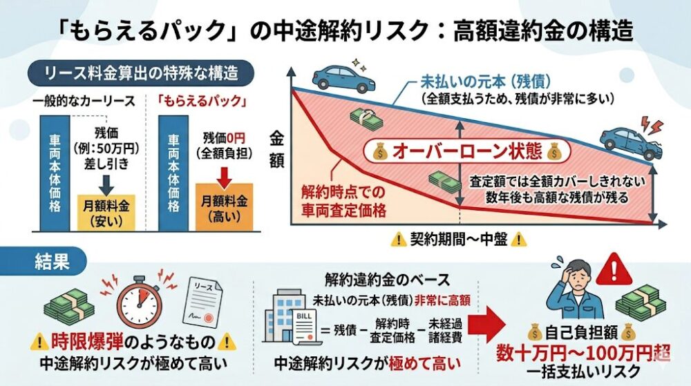 デメリット2:残価0円構造がもたらす中途解約時の極めて高額な違約金リスク