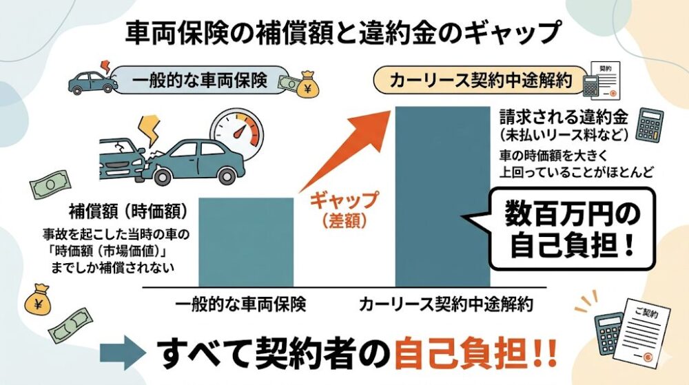 この「違約金」と「保険の補償額(時価額)」の間に生じる数百万円のギャップは、すべて契約者の自己負担となってしまいます。