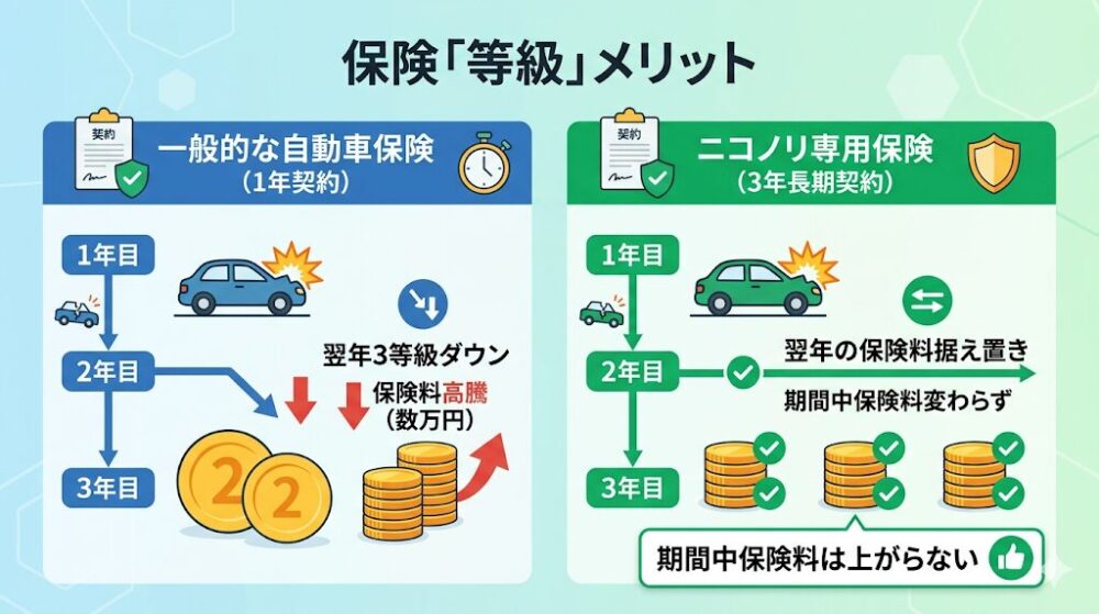 一般的な自動車保険は1年ごとの更新であり、事故を起こして保険を使用すれば、翌年の等級が3等級ダウンし、保険料が数万円単位で高騰します。しかし、ニコノリ専用保険はカーリースに特化した「3年間の長期契約」を結ぶことが可能です。