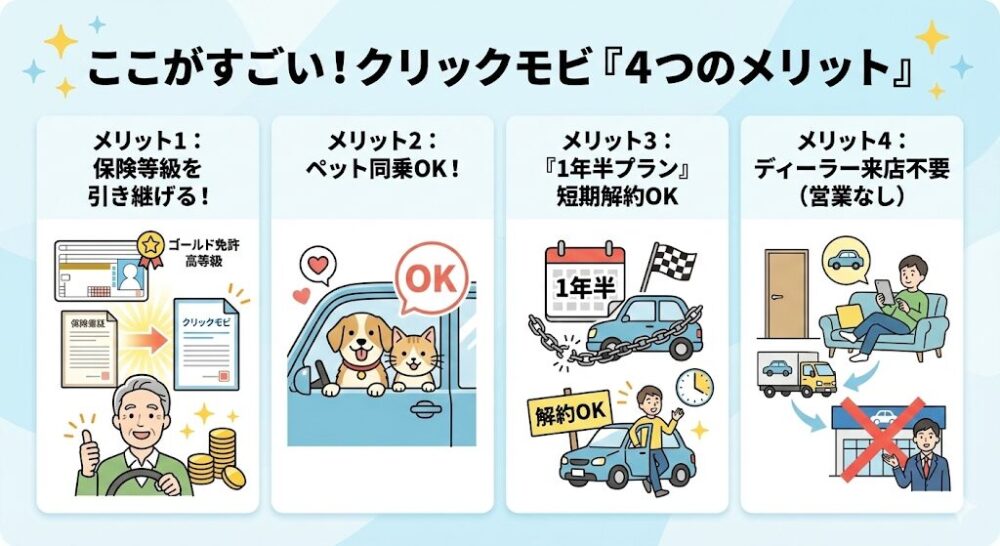 - クリックモビ: 「保険等級が高い人(割引がある人)」や「ペットを乗せたい人」におすすめ。