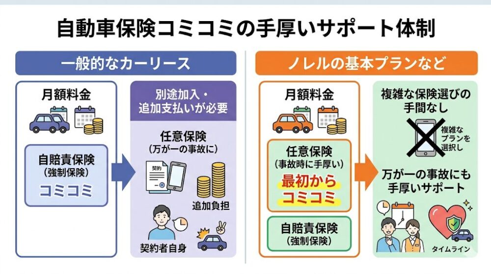 ノレルの基本プランなどでは、この任意保険が最初から月額料金にコミコミとなっているため、複雑な保険選びの手間が省け、万が一の事故の際にも手厚いサポートを受けることができます。