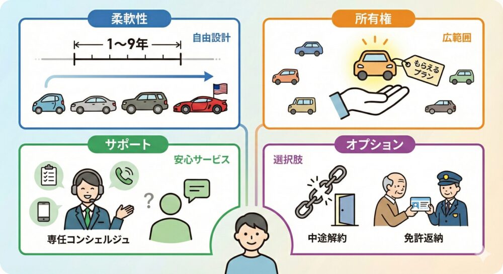 - 免許返納オプション: 高齢ドライバー向けに、免許返納時の中途解約金を免除するオプションです。これにより、70代以上のユーザーでも新車リースのハードルが下がります。