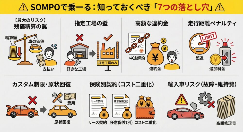SOMPOで乗ーるは、輸入車を含む豊富な車種と柔軟な契約プランが魅力ですが、契約方式が「オープンエンド」であるため、仕組みを理解せずに契約すると返却時に想定外の精算金が発生するリスクがあります。
