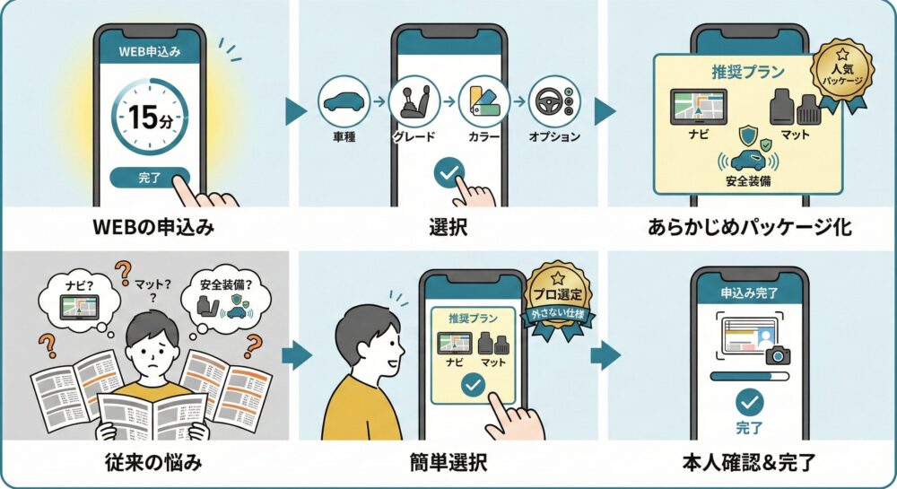 新車購入時、カタログを見ながら頭を悩ませるこうした選択も、KINTOなら「プロが選んだ間違いないセット」を選ぶだけ。車に詳しくない人でも、リセールバリューや実用性を考慮した「外さない仕様」を簡単に選べるようになっています。