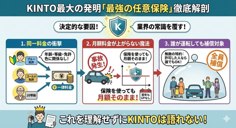 断言しますが、KINTOの付帯保険は、業界の常識を覆すほど手厚く、そしてユーザーに有利な設計になっています。これを理解せずにKINTOを評価することは不可能です。