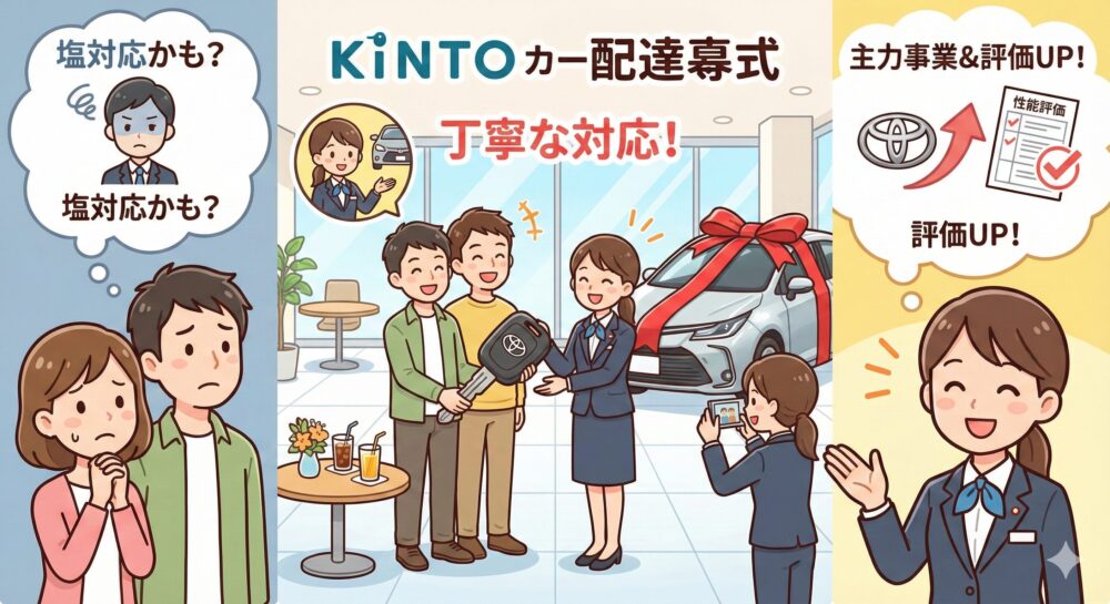 かつてはディーラー営業マンにとって、販売マージンが少ない(と言われる)KINTO客は「招かれざる客」だった時期もあったかもしれません。しかし現在は、メーカーが主力事業として推進しており、販売店側の評価制度もKINTO契約をプラスに評価する仕組みに変わってきているため、邪険に扱われることはまずありません。