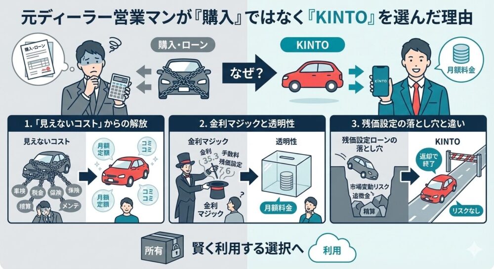 なぜ「車のプロ」である私が、あえて「所有」ではなく「利用」を選んだのか?そこには、ディーラーの現場にいたからこそ分かる「金利の罠」や「残価設定ローンのリスク」、そしてKINTOだけが持つ「構造的な優位性」が存在するからです。