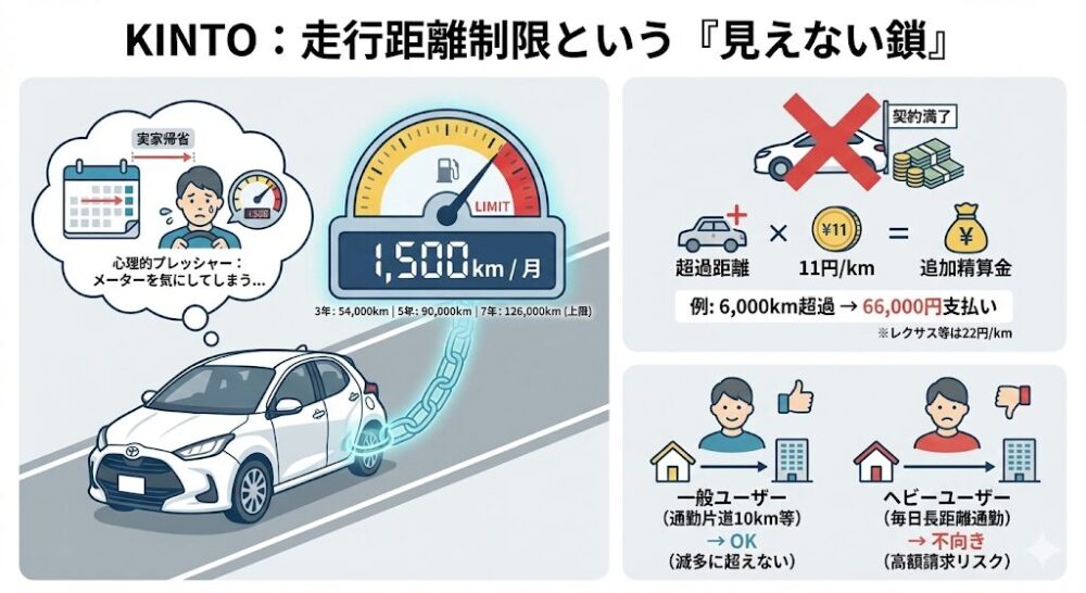 しかし、「制限がある」という事実自体が、心理的なプレッシャーになることは否めません。 「今月は実家に帰省したから距離が伸びたな…来月は遠出を控えようかな…」 このように、無意識にメーターを気にしてしまう瞬間があります。 もし契約満了時にトータルで超過していた場合、トヨタ車なら1kmあたり11円(レクサス・bZ4Xなどは22円)の追加精算金を支払う必要があります。