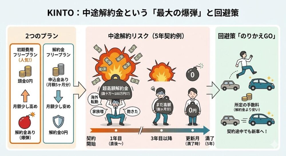 このリスクを回避するために、KINTOでは「のりかえGO」というサービスを用意しています。これを使えば、所定の手数料(月額の数ヶ月分など、解約金よりは安い)を払うことで、契約期間中でも新しい車に乗り換えることができます。 しかし、基本的には「契約期間中は乗り続ける覚悟」が必要です。3年先の未来が全く見えないという方は、最初から「解約金フリープラン」を選ぶか、KINTO以外の短期リースやレンタカーを検討すべきです。