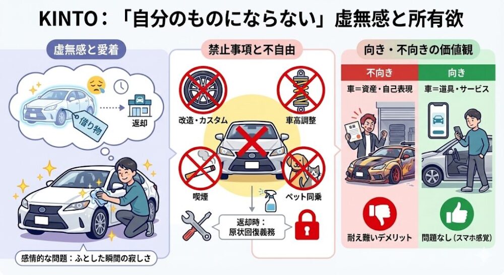 ここまでKINTOを絶賛してきましたが、公平な「専門家レポート」として、実際に使ってみて感じたデメリット、制約、そして「ここは気をつけたほうがいい」というポイントも包み隠さずお伝えします。