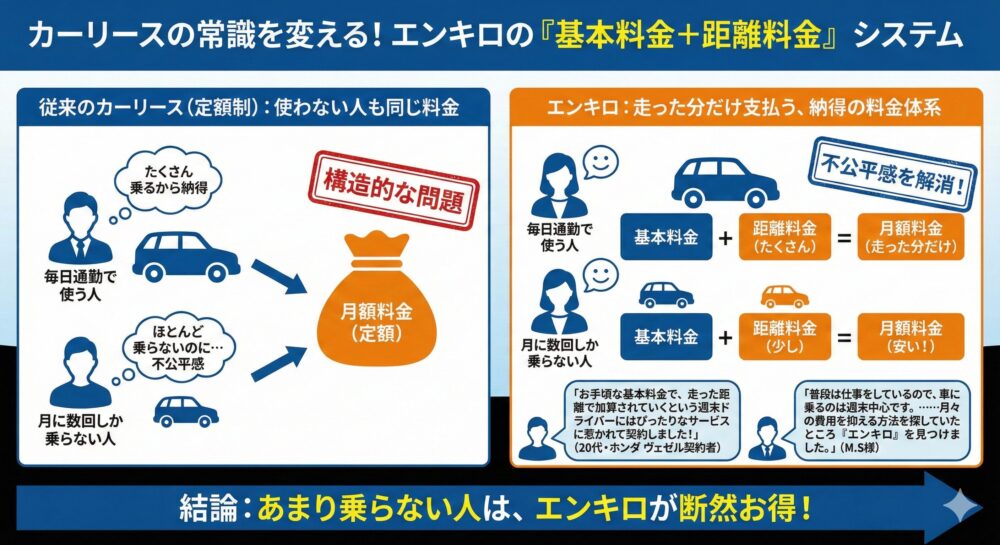 これまでのカーリース業界の常識は、「月々1万円から」といった「定額制」でした。これは家計管理がしやすいという大きなメリットがある一方で、構造的な問題を抱えていました。それは、「毎日通勤で使う人」も「月に数回しか乗らない人」も、同じような基本料金設定になっていた点です。