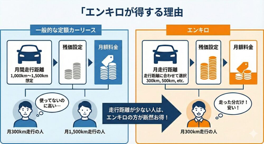 「週末しか乗らない」「あまり遠出はしない」という方におすすめなのがエンキロです。……走行距離が少ない人は月々の支払いが驚くほど安くなります。