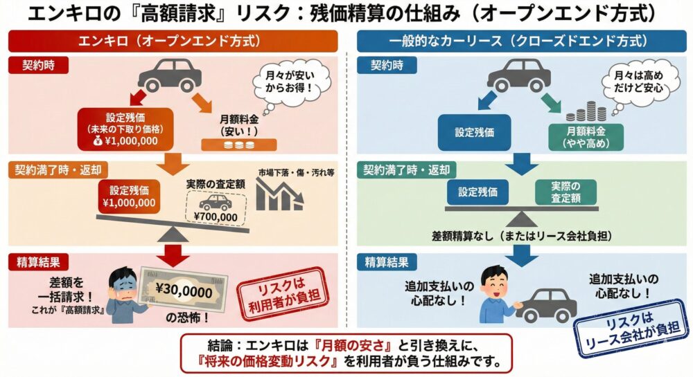 「契約満了時の『残価精算』で高額請求の恐怖。『返却時に思ったよりも高額な精算が発生した』という声は、エンキロの仕組みにおける最大のリスクを示しています。」