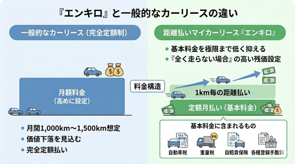 エンキロの最大の特徴は、一般的な「完全定額制」とは根本的に異なる「定額月払い(基本料金)」+「走った分だけの1km毎の距離払い」という従量課金制(距離払いマイカーリース)を導入している点にあります。