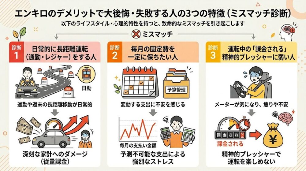 もし、前述の【ミスマッチ診断】で挙げた3つの特徴(長距離運転が多い、固定費を一定に保ちたい、メーターが回るプレッシャーが嫌だ)のうち、一つでも当てはまる要素があるならば、客観的に見てエンキロはご自身のライフスタイルに致命的なミスマッチを起こす可能性が極めて高いと言わざるを得ません。